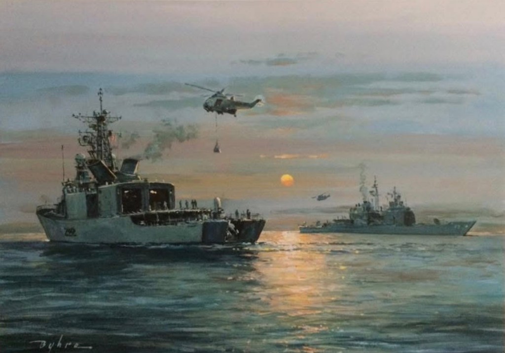 “Rendering Assistance” by Maritime Artist Dale Byhre, which depicts the moment 35 years ago that HMCS Athabaskan (at left) escorted the damaged cruiser USS Princeton (right). This shows CH-124 Sea King helicopters transporting supplies. Used with the written permission of the artist, who has prints available for sale.