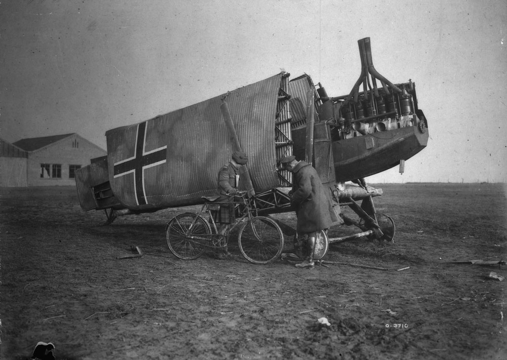 Nicknamed the “flying tank,” this was a slow, low flying observation and ground attack aircraft with an armoured section (like an enormous tub with 5mm thick armour around the crew and engine), the basic structure of the airframe was early aluminum tubing (“duraluminium”), with corrugated aluminum sheets covering the wings and tail surfaces. This would influence later aircraft, and was quite the departure from the fabric-over-wood bracing on other aircraft. The J1 was armed with machine guns and bombs. Only a little over 220 of these were produced. The best photos of this aircraft, models of it showing the paint schemes, and parts of other J1s can be found at Wingnuts model-making site. Today, Junkers 586, produced in 1918, is the World’s only reasonably complete example. This J1 was exhibited at some of the War Trophies displays (see War Trophies exhibits for a relevant photo from Hamilton), the Canadian National Exhibition in Toronto in 1919, then in 1939 it was transferred from CFB Borden to the Aeronautical museum at the Rockcliffe Air Station, then on to storage at the Canadian War Museum. When air-related collections were consolidated in the 1960s, it moved to the Aviation Museum (Now Canada Aviation and Space Museum). Photos show it in various conditions. For an upcoming FWW-themed centenary exhibit at the CASM museum, it is rumoured that it will be out on display again in the main museum.The aircraft in the official photos from November 1918 could be this same aircraft. The guard near the aircraft would seem to indicate that military authorities had some purpose in mind for this.