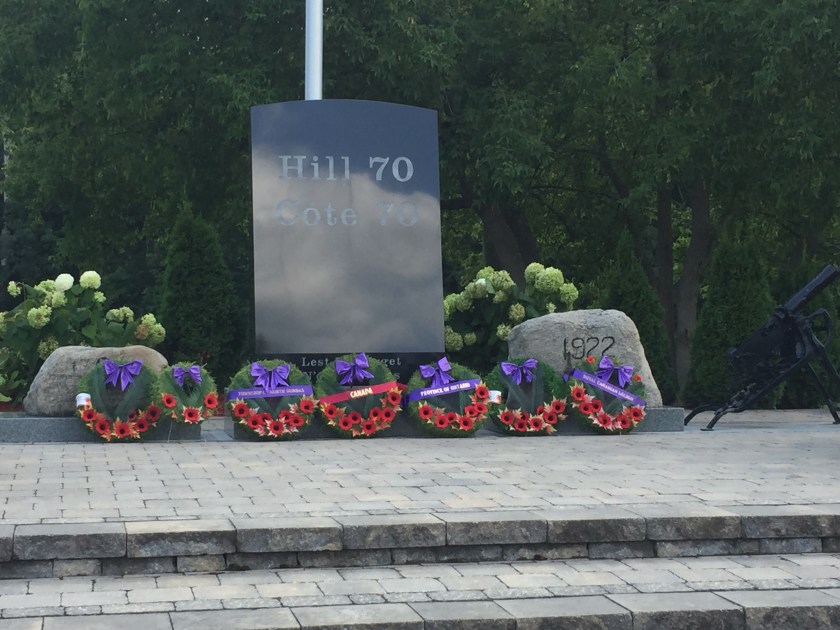 Update to Hill 70 post below, from today’s ceremony to mark the Battle at the Hill 70 Memorial in Mountain, ON. A moving ceremony, with representatives of local military units, Legion and Lions Club Branches (who both contributed to restoring this memorial) and many others. A 6-pounder anti-tank gun from the Swords & Ploughshares Museum marked the moment of silence.