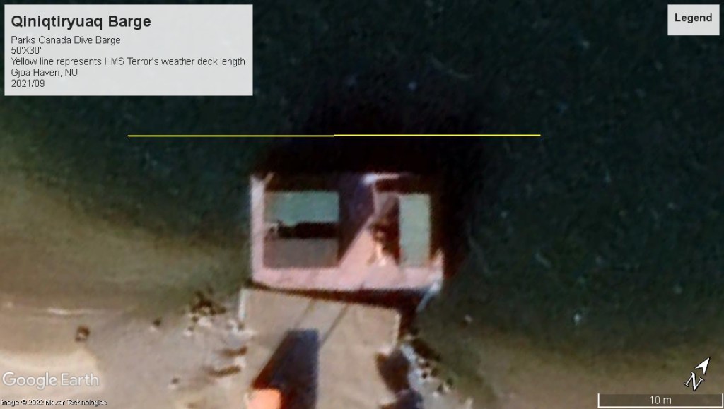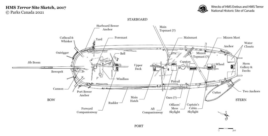 There has not yet been any official reporting about the 2022 Parks Canada work. It is a safe bet that the balance of research is focusing on the fragile or “dynamic” site: HMS Erebus (discovered by Parks during the Sep. 2014 search in Wilmot and Crampton Bay, after years of searches which followed up on Inuit oral history of a wreck in this area).2 In the long 165-years that Erebus remained unlocated, there must have been decades where the wreck, in the frigid waters of Wilmot and Crampton Bay, would have appeared almost untouched by time’s passage. Unfortunately, her condition has worsened in the last years, as ice or ocean swells take their toll on upper surfaces, such as the weather deck and supporting structures. The wreck is only in about 11 M of water. There is real urgency to conduct a thorough survey.