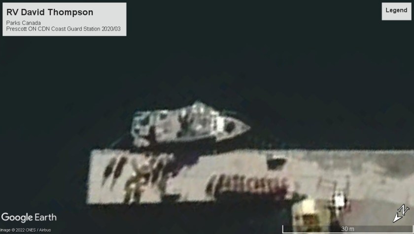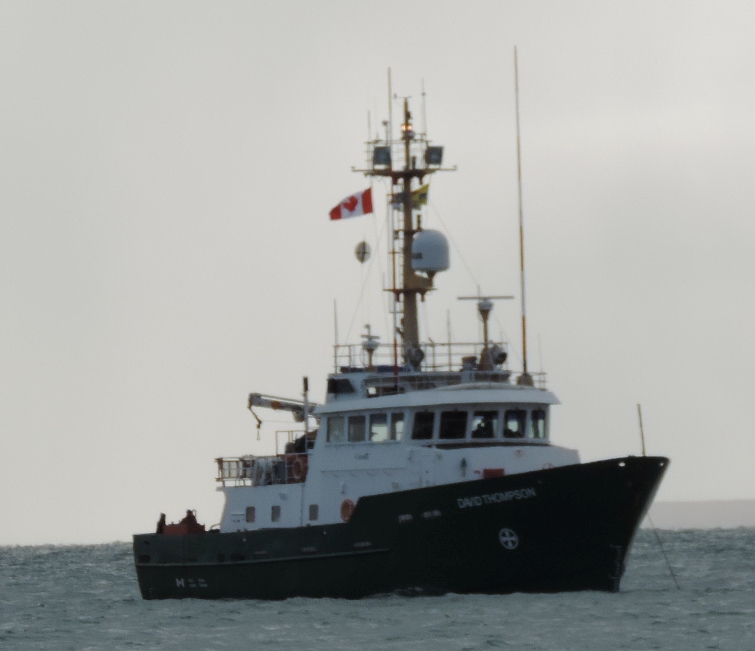 RV David Thompson (2017) LOA 95’ / 29m TDISP 228 tons. Originally Canadian Coast Guard Fisheries Patrol vessel CCGS Arrow Post (1992-2016) before transfer to Parks Canada. Now equipped with up to two Rigid Inflatable Boats and a hydraulic crane. RV David Thompson made a brief transit back through the Simpson Strait to Gjoa Haven 7 September, but appears to have returned to the vicinity of Erebus the next day.