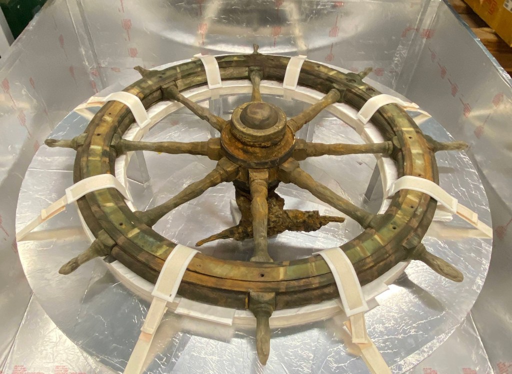 During the 1983 RPV and WASP operations, a small number of artifacts, and notably the ship’s wheel, were brought to the surface. Parks Canada underwater archaeologist Robert Grenier did not support the recovery of items from the site – a process that requires additional permits and permissions. Once the objects were at the surface, he worked diligently to safeguard the preservation of these wooden artifacts and prepare them for transportation.