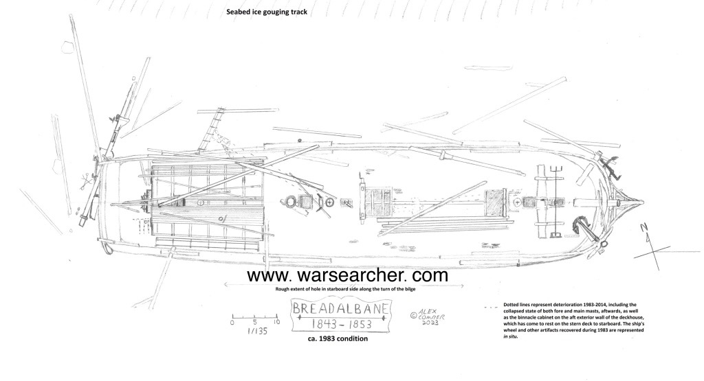This second post will focus on the 1980s discovery and explorations of the incredibly intact wreck of Breadalbane off Beechey Island, Nunavut. The first post summarized the loss of this supply ship in the High Arctic in Aug. 1853, while resupplying search expeditions looking for the Franklin Expedition. The third post shows our construction of an archaeologically-based scale diorama of this National Historic Site of Canada. A fourth post explores the wreck based on Parks Canada’s 2014 visit.