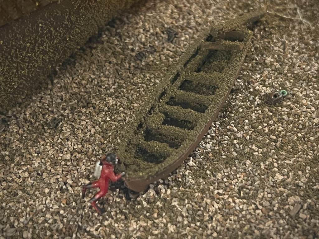 The boat appears to be a standard 23-foot ship’s cutter, about 7-feet at its broadest part. It is clinker-built (overlapping boards) and has recessed slots for rowing with eight or so oars. It has several thwarts for crew and passengers, and could also be fitted with two small masts to sail it. Some upper sections of the gunwales appear to be damaged or rotted through, and it is unclear to us if it still has some type of fabric cover or is instead almost completely filled with sediment. A fallen section of davit or post rests at the squared-off stern, overhanging the transom. The rudder is not installed.1