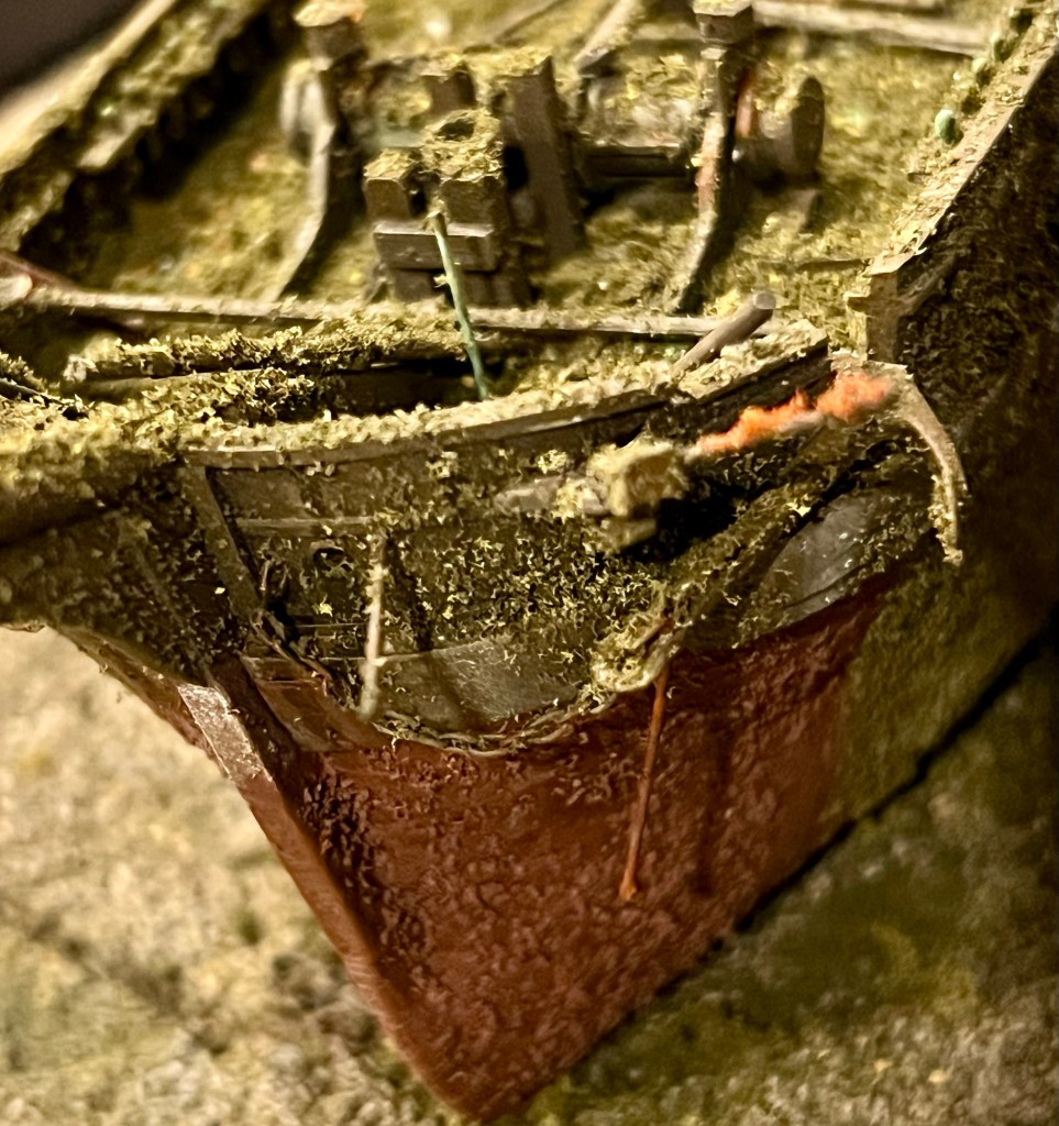 Under all the accumulated silt and growth, there is likely to be a bewildering variety of artifacts, which my interpretation can only begin to hint at. The ship’s boat off the port quarter of the wreck was given a modest update: A more accurate fallen davit resting across the stern.