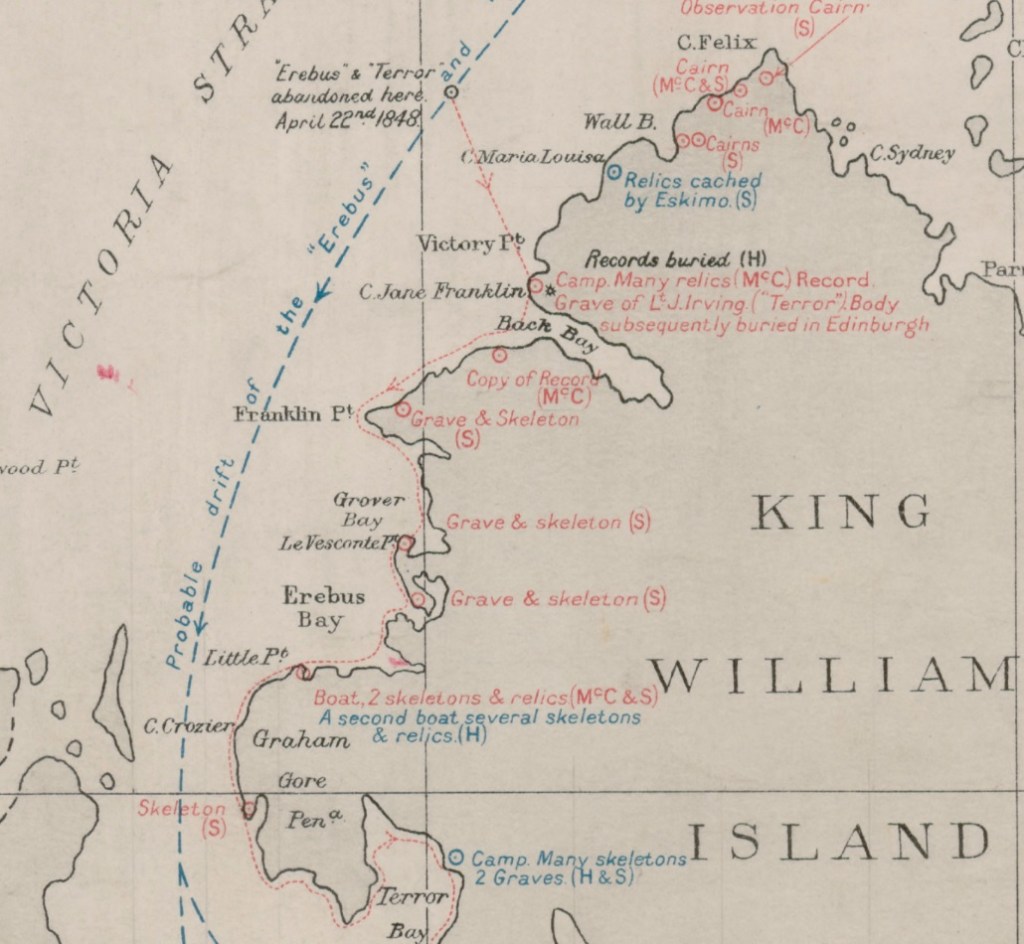 - Matthew Betts HMS Terror: The Design, Fitting and Voyages of the Polar Discovery Ship (Seaforth 2022) and “A Man Hauled Boat Sledge from HMS Terror” https://buildingterror.blogspot.com/2019/01/a-man-hauled-boat-sledge-from-hms-terror.html . Also see this book for Dr. Betts’ description of how the Erebus Bay boat seems to have closely followed the design of Sir George Back’s earlier boats, used to explore Back’s Great Fish River, exactly where the Franklin crews were attempting to get to. ↩︎