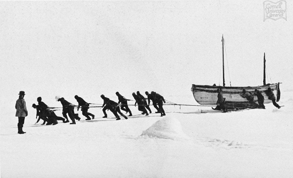 On May 23rd, 1859, at a wide bay on the frozen western shores of King William Island, a group looking for the lost Franklin Expedition found something incredible: A large boat on a sledge. Fourteen years after Franklin’s two ships had left Greenhithe, England, searchers had finally arrived at “ground zero” of the Franklin Expedition escape saga. They were a decade too late. Quartermaster Henry Toms and Carpenter’s Mate George Edwards – both members of Lt. William Hobson’s detached sledge party searching the coast as part of Francis Leopold McClintock’s Franklin search expedition – first spotted something odd projecting out of the snow as they scouted ahead of their mates.1 Closer examination revealed it to be a wooden stanchion, hanging like a beacon over the curved outlines of a gunwale in the high drifts of snow – beneath their feet was the ghostly outline of a large boat.