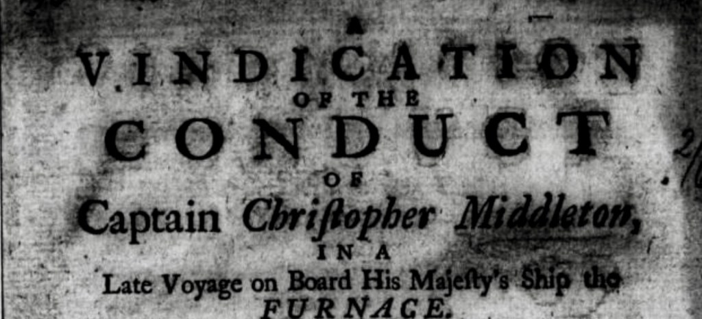 There were hazards ahead, but Middleton held his course: He maintained that there were only impassable rivers and streams leading westwards into the interior of the massive continent. Middleton’s findings contradicted Dobbs’ views and could undermine his whole project, so with brutal efficiency Dobbs denounced his former ally and induced the captains’ shipmates to turn against him. Lt. Rankin, Surgeon Edward Thompson, and John Wigate all deserted Middleton. Most cutting was the defection of his cousin and longtime Ship’s Mate, Moor. Dobbs accused Middleton of taking a bride from his former employer, the HBC, to conceal his true discoveries. He followed this with claims that Middleton had invented the Frozen Strait, and that he had falsified information about the shape and extent of Repulse Bay.29 Dobbs’ speculative geography – he had never and would never journey near Hudson’s Bay – cast doubt on the existence of a real strait, even as he conjured up a great western corridor communicating out of Wager or Repulse Bay. Middleton replied by publishing a 165-page defence of his conduct, which reproduced some of Furnace’s daily log, and relevant correspondences (including between himself and Dobbs).30 Despite the calumnies of his senior staff, fifteen of his crew members came forward to provide statements in his defence.31 Far from settling the matter, Middleton’s Vindication caused a tit-for-tat exchange of publications that further damaged his reputation.32 In several of his publications about the history of British exploration, historian Glyn Williams revisited the events of the Middleton Expedition and explored the escalating controversy. Williams concluded that “Middleton’s story is a sad one, for he was an outstanding scientific navigator and a fine explorer whose career was wrecked by a malicious campaign of denigration.”33