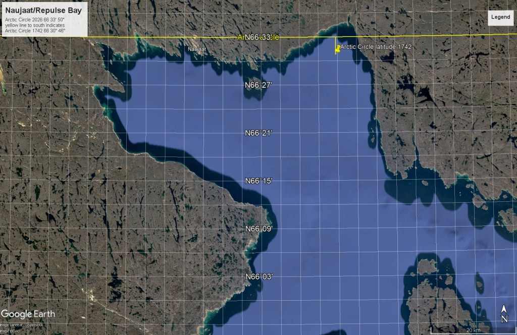 Lost amidst all the rancor was an achievement, which may have had little import then, but should now: Christopher Middleton’s expedition had been exploring the Arctic!34 As noted above, Furnace rounded Cape Hope on the morning of 7 August 1742 with crew believing it could be the last and highest point of land of continental North America. The modern town of Naujaat (formerly named Repulse Bay) is located about a third of the way westwards along the northern shore of Repulse Bay. It is one of the few communities in the world located directly on the Arctic Circle, at latitude 66°33’50″ north.35 This line of latitude passes just inland of the Bay’s northwestern shore, where there is a small inlet or river mouth that continues towards North Pole Lake (a notable overwintering spot in the later expeditions of Dr. John Rae). East of Naujaat, the shoreline indents towards the northeast, forming Haviland Bay.36 It is here that the Circle latitude passes from the rocky shores into the shallow waters near Qaggitalik Point.