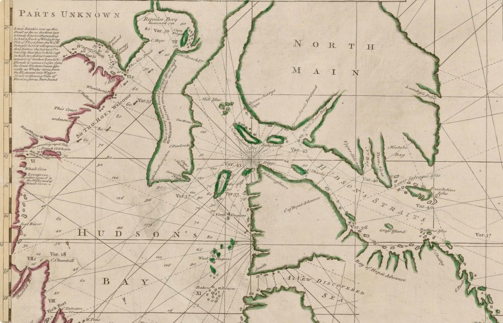 In 1741 – in the midst of an escalating war of imperial European powers – Christopher Middleton sailed to Hudson’s Bay to locate a Northwest Passage. It was an era when Europeans had not yet laid eyes on vast extents of the North American continent. When explorers bothered to consult indigenous peoples, their knowledge about their own ancestral lands was co-opted to support speculative geography: Fantastical landscapes, vast inland seas, expansive straits, and rivers shimmering with copper and gold. Spain held a virtual monopoly of trade in the Pacific, despite the northern coasts of the Pacific coastline being unknown. French explorers and fur traders were pushing west from New France along lakes and river systems. In Britain, there was great enthusiasm for the idea of a commercially viable maritime trade corridor stretching to the South Sea. The Admiralty prioritized the search for the Passage over the adjacent quest for the North Pole, the search for a massive and temperate southern continent, or the exploration of the far side of the World. Christopher Middleton did not find a passage out of the Bay in mid-1742, and he paid a terrible price for it. His expedition deserves to be credited for what it did accomplish: On the first Admiralty discovery mission of its kind, along a section of the Hudson’s Bay coast that had destroyed or turned back other expeditions, Middleton diligently surveyed, he sighted the Frozen Strait, and, in the very corner of a bay that had repulsed his hardy crew from their main objective, he reached the Canadian Arctic.
