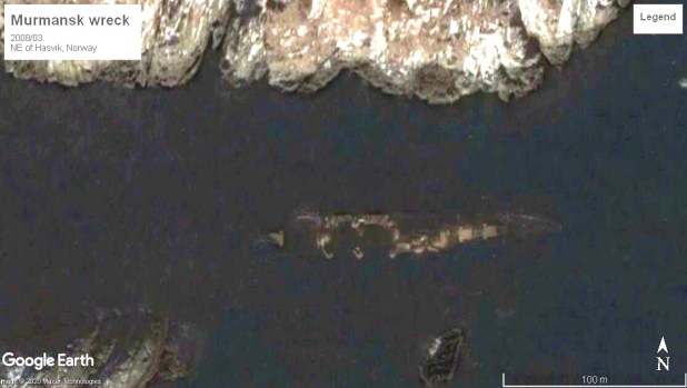 Google Earth view adjusted to highlight the visible wreck.