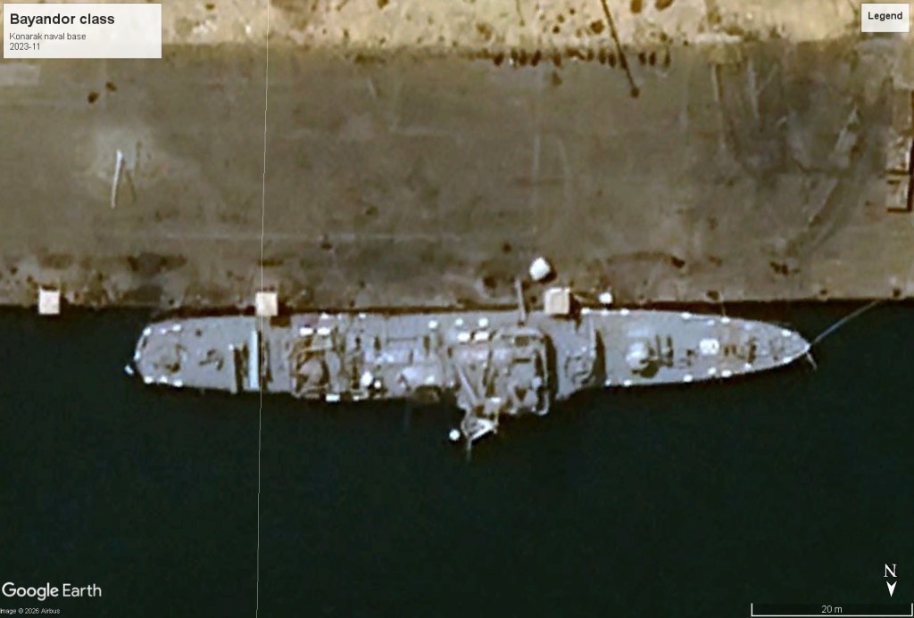 Bayandor Class (US PF-103 design, built for Iran) LOA 276′ / 84.1 m TDISP 1,100 tons (4 units, service 1963-2026: 2 destroyed during 1980 war, two reportedly destroyed 1 March 2026). Class was upgraded with new guns and two double cannister antiship missile containers added to quarterdeck in early 2010s.