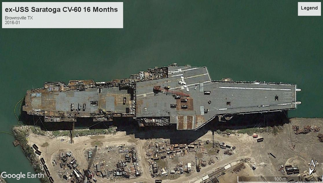 ex-USS Constellation CV-64 commissioned 1961 (41 years active service, 12 years in reserve/inactive) Kitty Hawk Class, LOA 1,069′ TDISP 82,000 tons. Arrived at Brownsville TX January 2015. Scrapping complete 10 may 2017. ex-USS Ranger CV-61 commissioned 1957 (35 years active service, 22 years reserve/inactive) Forrestal Class LOA 1,046′ TDISP 81,000 tons. arrived at Brownsville TX July 2015. Scrapping complete 1 November 2017. ex-USS Independence CV-62 commissioned 1959 (39 years active service, 18 years in reserve/inactive) Forrestal Class LOA 1,070′ TDISP 81,000 tons. Arrived at Brownsville TX 30 May 2017. Scrapping complete early 2019. ex-USS Saratoga CV-60 commissioned 1956 (37 years active service, 20 years in reserve/inactive) Forrestal Class LOA 1,063′ TDISP 81,000 tons. Arrived at Brownsville TX mid-September 2014. Dismantling stalled as ESCO Marine shut down operations. The new SteelCoast bought the assets and the hulk, and resumed work. The Dec. 2017 view is the last available, as the most recent captures skipped all the final stages of dismantlement. Scrapping completed 31 March 2019. Ex-USS Kitty Hawk CV-63 commissioned 1961 (48 years active service, 13 years in reserve/inactive) Kitty Hawk Class, LOA 1,069′ TDISP 82,000 tons. Arrived at Brownsville TX May 2022, only released view from June 2023.