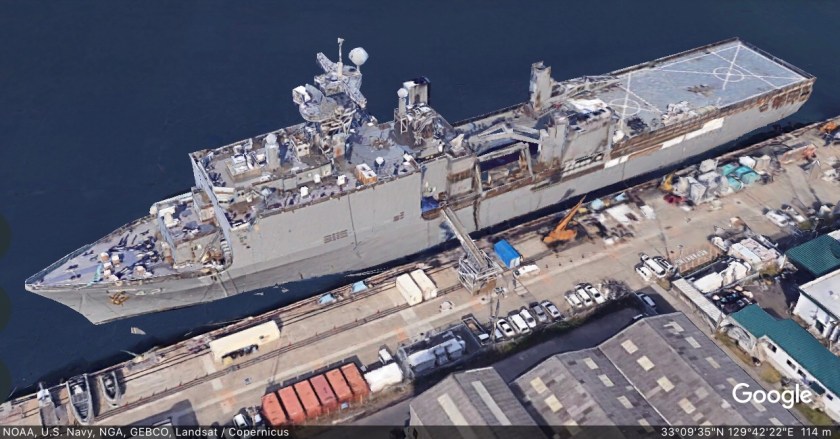 USS Ashland LSD-48, 2005 NARA: 330-CFD-DN-SD-06-05765 PHAN Finley Williams, USNGoogle Earth 2016/03 capture modified to show outlines of 440-foot long internal well deck on Whidbey Class LSD (yellow box), which can hold 4 or possibly 5 Landing Craft Air Cushioned (LCAC). For size comparison this has been overlaid with a 445′ Oliver Hazard Perry Class Frigate, San Diego 2012 capture (see retired USN listing for full view of this ship)USS Germantown commissioning ceremonies held in interior of massive well deck, 1986. View appears to be from near the stern gate looking forward. NARA: 330-CFD-DN-SN-86-04016 Lockheed Shipbuilding Co.USS Germantown LSD-42, Sasebo, Japan