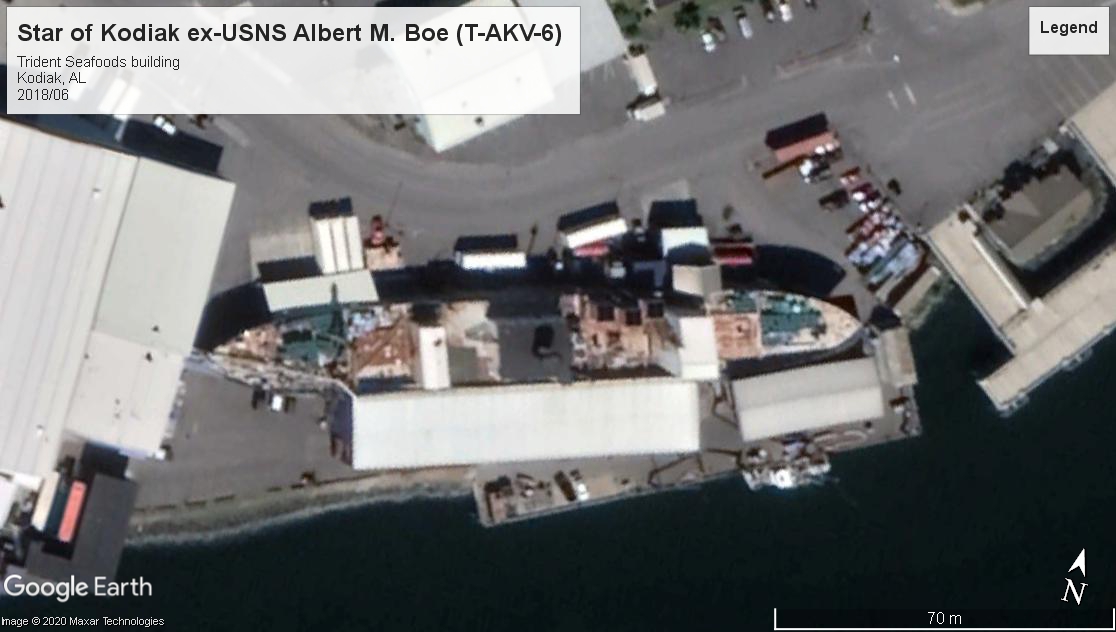 USNS Albert M. Boe T-AKV-6 (1945) last Liberty Ship built. Commissioned in the USN 1950-1954. Disposed sold 1964 as SS Kodiak Star fish cannery ship. Now a landlocked building, Kodiak AL, in same role for Trident Seafoods.