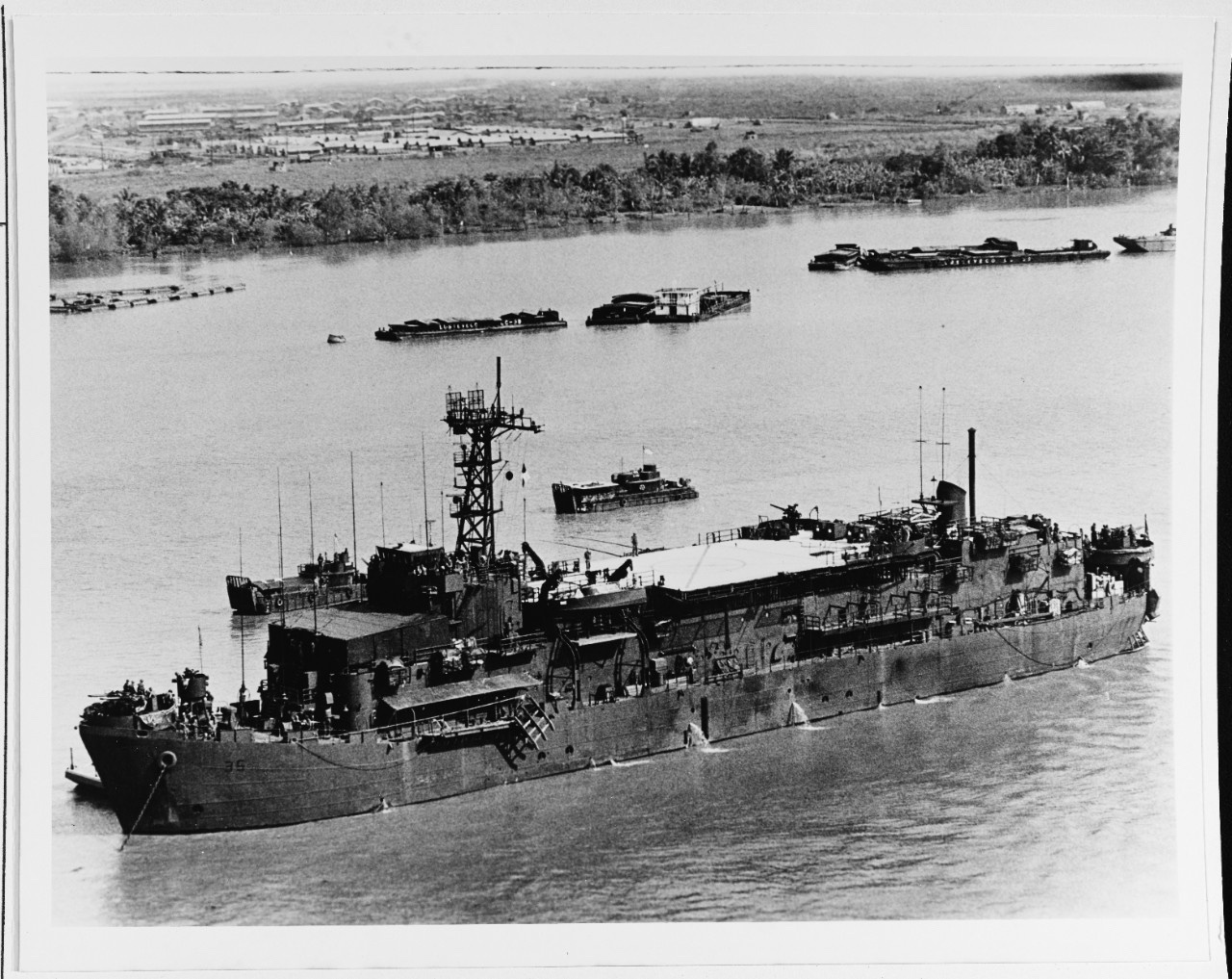 Benewah Class Barracks ships LOA 328′ TDISP 4,000 tons. (16 converted or purpose-built with variations, 2 remain as APL barracks ships) Conversion of an LST-542 Landing ship late in WW2. Several were activated during the Vietnam War to Riverine mother ships/combatants in the Mekong Delta. They were armed with 40mm AA guns and simple 3″ mounts. Excellent article here.