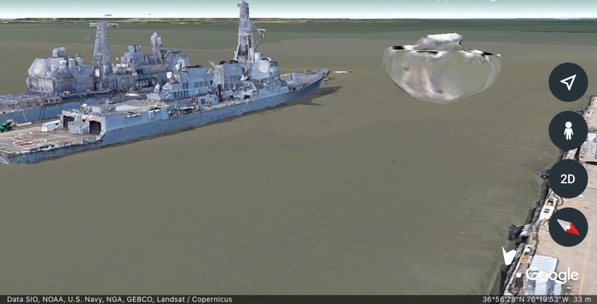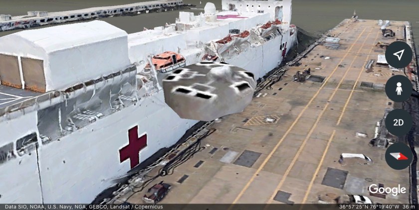 There are only two possibilities: this most dire one, or they could also be badly-rendered dockyard lighting towers whose entire support has been omitted in Google Maps 3D view. Shipsearcher staff prefer to believe in the existence of a large shadow force of UFOs! Have a safe, reasonable April Fools’ Day!