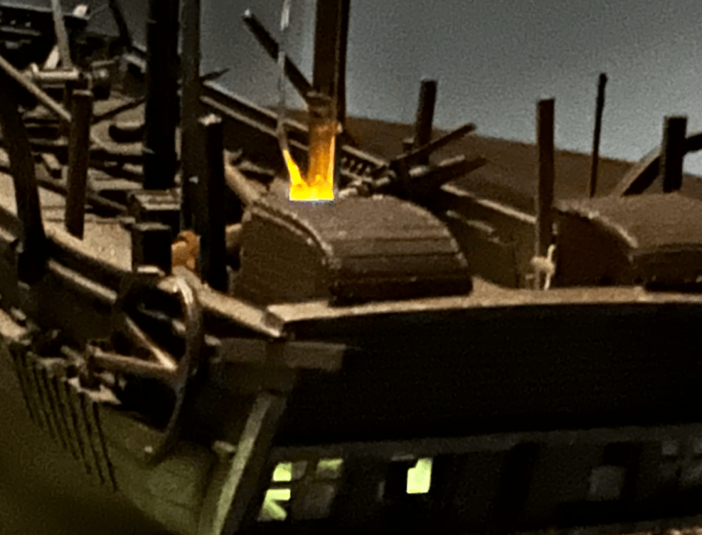 I modelled the stanchions (the two posts rising out of the hull painted two-tone black and white) to be high, with gaff jaws at their tops (as described by Lt. Hobson). Some practical tests with the model revealed that the pronounced list observed in 1859 meant that, in order for Hobson’s team to have spotted anything emerging from the high drifts of snow, that stanchion would have to be significantly taller than represented in most reconstructions. With its gaping jaws open to the sky, it must have appeared a grim marker, indeed!